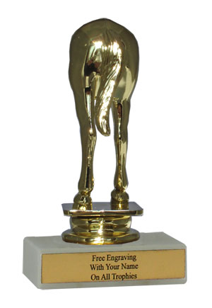 There is nothing cheap about this budget-minded trophy. It's perfect as a gag trophy or for the biggest loser of your event or league. Features a gold-tone plastic horses rear figure, a real white marble base and a gold engraved plate with black text. Also includes up to three lines of engraving for free, including name personalization! Qualifies for Ships from Marquette, MI. in 1-2 business days. Measures about 4 - 4 1/2" tall. SKU: QSBUDGAG-TC.