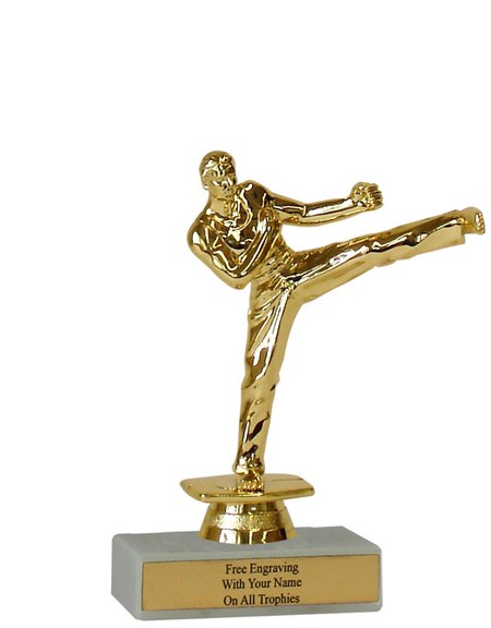 There is nothing cheap about this budget-minded trophy. It's perfect as a general karate achievement trophy or as a kid's participation trophy. Features a gold-tone plastic karate figure, a real white marble base and a gold engraved plate with black text. Also includes up to three lines of engraving for free, including name personalization! Qualifies for Ships from Marquette, MI. in 1-2 business days. Measures about 4 - 4 1/2" tall. SKU: QSBUDBASE-TC.