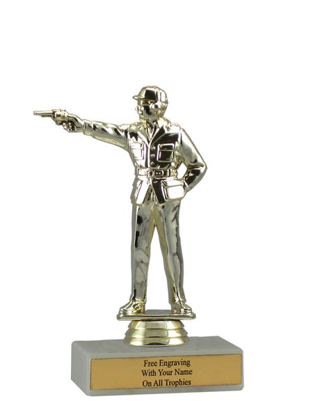 There is nothing cheap about this budget-minded trophy. It's perfect as a general marksman achievement trophy or as a participation trophy. Features a gold-tone plastic marksman / shooter figure, a real white marble base and a gold engraved plate with black text. Also includes up to three lines of engraving for free, including name personalization! Qualifies for Ships from Marquette, MI. in 1-2 business days. Measures about 4 - 4 1/2" tall. SKU: QSBUDMARK-QTT.