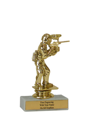 There is nothing cheap about this budget-minded trophy. It's perfect as a general paintball achievement trophy or as a kid's participation trophy. Features a gold-tone plastic paintballer figure, a real white marble base and a gold engraved plate with black text. Also includes up to three lines of engraving for free, including name personalization! Qualifies for Ships from Marquette, MI. in 1-2 business days. Measures about 4 - 4 1/2" tall. SKU: QSBUDPAINT-QTT.