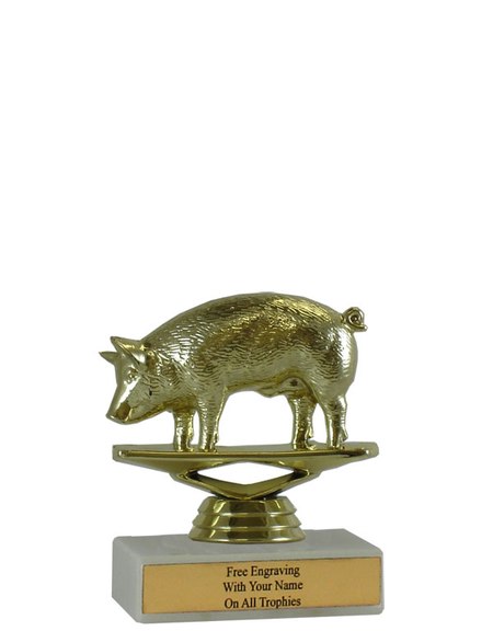 There is nothing cheap about this budget-minded trophy. It's perfect as a general achievement trophy or as a participation trophy. Features a gold-tone plastic pig figure, a real white marble base and a gold engraved plate with black text. Also includes up to three lines of engraving for free, including name personalization! Qualifies for Ships from Marquette, MI. in 1-2 business days. Measures about 4 - 4 1/2" tall. SKU: QSBUDPIG-QTT.
