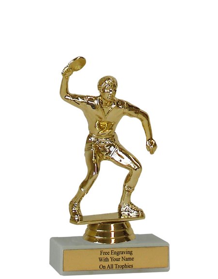 There is nothing cheap about this budget-minded trophy. It's perfect as a general ping pong / table tennis achievement trophy or as a kid's participation trophy. Features a gold-tone plastic figure, a real white marble base and a gold engraved plate with black text. Also includes up to three lines of engraving for free, including name personalization! Qualifies for Ships from Marquette, MI. in 1-2 business days. Measures about 4 - 4 1/2" tall. SKU: QSBUDPING-TC.