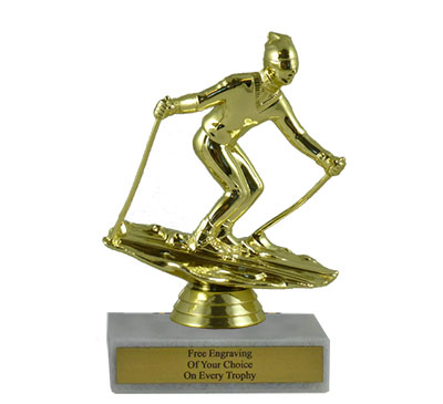 There is nothing cheap about this budget-minded trophy. It's perfect as a general downhill skiing achievement or participation trophy. Features a gold-tone plastic downhill skier figure, a real white marble base and a gold engraved plate with black text. Also includes up to three lines of personalized engraving for free, including name personalization! Measures about 4 - 4 1/2" tall. Ships from: Marquette, Michigan. SKU: qsbudskicc-tc.