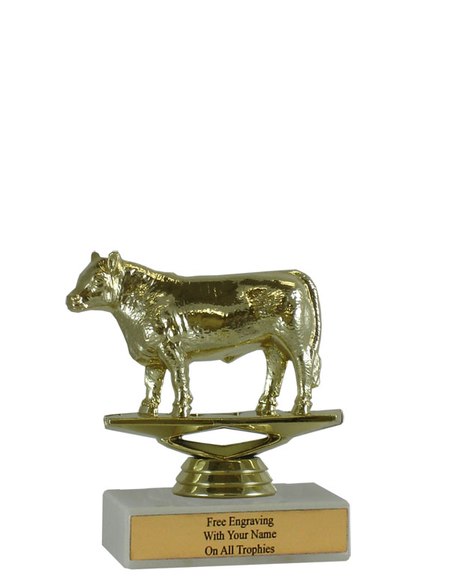 There is nothing cheap about this budget-minded trophy. It's perfect as a general achievement trophy or as a participation trophy. Features a gold-tone plastic steer (cow) figure, a real white marble base and a gold engraved plate with black text. Also includes up to three lines of engraving for free, including name personalization! Qualifies for Ships from Marquette, MI. in 1-2 business days. Measures about 4 - 4 1/2" tall. SKU: QSBUDSTEER-QTT.