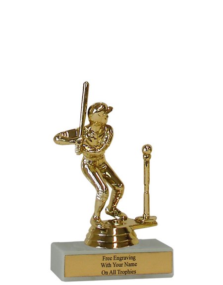 There is nothing cheap about this budget-minded trophy. It's perfect as a general t-ball achievement trophy or as a kid's participation trophy. Features a gold-tone plastic t-ball figure, a real white marble base and a gold engraved plate with black text. Also includes up to three lines of engraving for free, including name personalization! Qualifies for Ships from Marquette, MI. in 1-2 business days. Measures about 4 - 4 1/2" tall. SKU: QSBUDTBALL-TC.