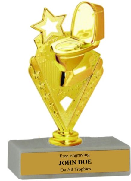 A perfect trophy for a fantasy loser or last place finisher. Features a gold-tone plastic toilet bowl figure, a real white marble base and a gold engraved plate with black text. Also includes up to three lines of personalized engraving for free, including name personalization! Measures about 4 - 4 1/2" tall. Perfect for celebrating your last place loser! Ships from: Marquette, Michigan. SKU: budget-series-toilet-bowl-tc.