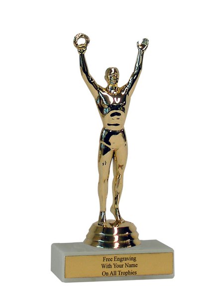 There is nothing cheap about this budget-minded trophy. It's perfect as a general victory achievement trophy or as a kid's participation trophy. Features a gold-tone plastic victory figure, a real white marble base and a gold engraved plate with black text. Also includes up to three lines of engraving for free, including name personalization! Qualifies for Ships from Marquette, MI. in 1-2 business days. Measures about 4 - 4 1/2" tall. SKU: QSBUDVICT-TC.