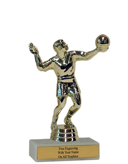 There is nothing cheap about this budget-minded trophy. It's perfect as a general volleyball achievement trophy or as a kid's participation trophy. Features a gold-tone plastic volleyball player figure (choose from male or female), a real white marble base and a gold engraved plate with black text. Also includes up to three lines of engraving for free, including name personalization! Qualifies for Ships from Marquette, MI. in 1-2 business days. Measures about 4 - 4 1/2" tall. SKU: QSBUDVOLL-TC.