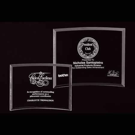 Curved, beveled, and free standing, our bent glass awards possess simple yet elegant styling. Made from jade crystal. Gift box included. Small Measures: 7"H x 10"W Large Measures: 9"H x 12"W Magnificent for recognizing excellence and victory. SKU: 8201-jc.