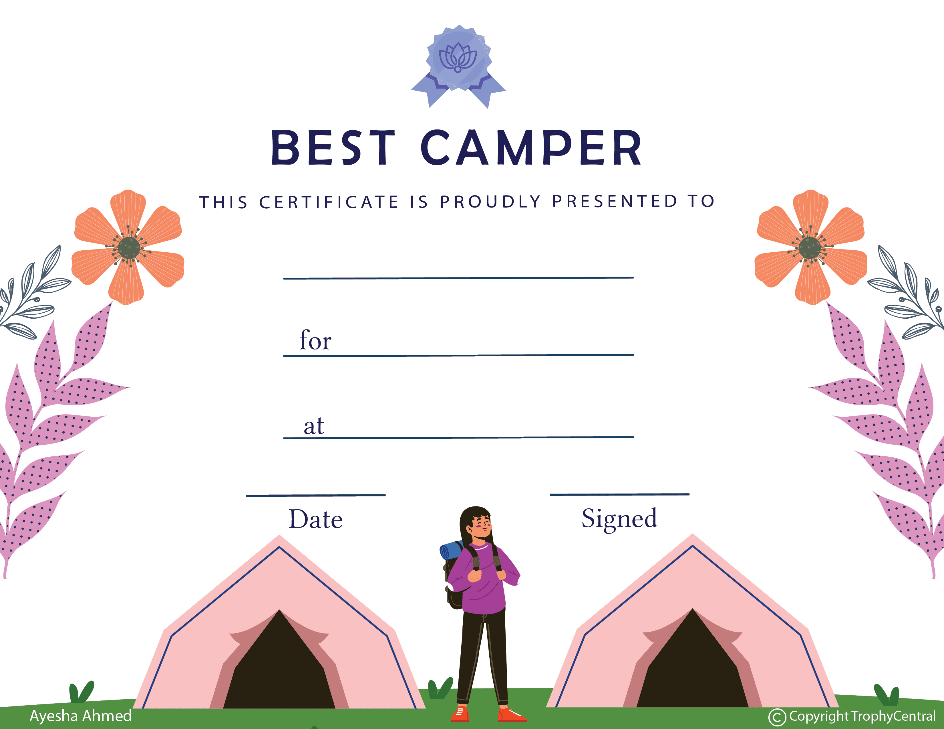 This best camper award (female) certificate template is free! Our free certificates were designed to be printable and use less ink to save you money. Simply press the View Now Button and then right click on the image and select Save File to download it. Award certificates measure 8 1/2" x 11". Outstanding for honoring achievement and success. SKU: academic-free-tc.