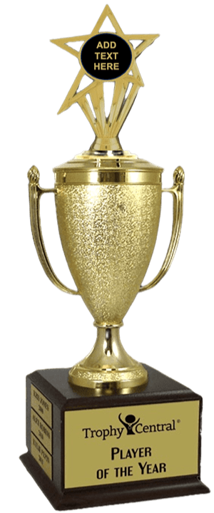 This popular Champion's Cup trophy features a Cherry finish wood base (5 1/2" x 4"), an 8 3/4" gold-tone plastic cup and an engraveable 2 inch insert. It also includes up to 4 lines of personalized engraving on the base for free, including name personalization! 1" x 3" Side Plates can be added for an additional price if used as a perpetual trophy. Measures about 13" tall! A wonderful choice for rewarding excellence and victory. Ships from: Marquette, Michigan. SKU: champions-blank-i-tc.