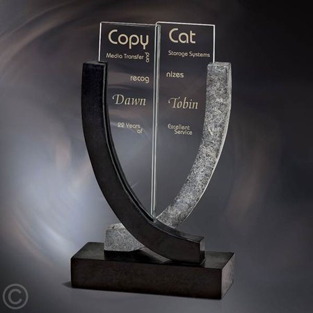 Champion design elements compose the Chalice. Its swooping spans of grey and ebony marble embrace two elegant glass panels artistically arced at right angles. The panels afford an equally elegant location for you etched message. Includes one location and one color imprint! Please send any artwork (EPS or AI files only) to sales@trophycentral.com. Please Note: personalized engraving & artwork are for illustrative purposes only; all awards start blank. If you would like a design similar to one shown on a sample, please contact us for availability or pricing. SKU: vftm066x-va.