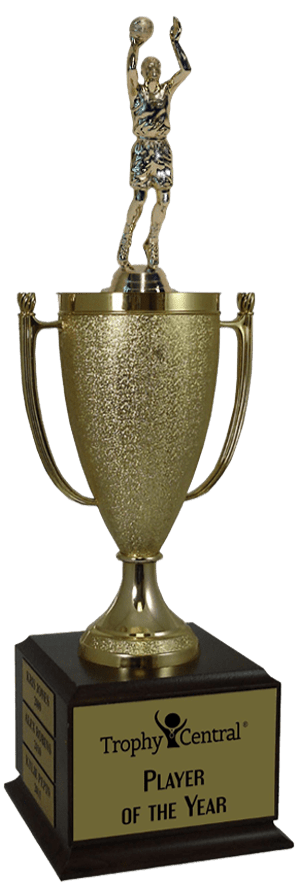 This popular basketball champion's cup trophy features a Cherry finish wood base (5 1/2" x 4") and an 8 3/4" gold-tone plastic cup. It also includes up to 4 lines of personalized engraving for free, including name personalization! 1" x 3" Side Plates can be added for an additional price if used as a perpetual trophy. Measures about 13" tall! Ideal for basketball season competitions and playoff celebrations. Ships from: Marquette, Michigan. SKU: champ-cup-basketball-tc.