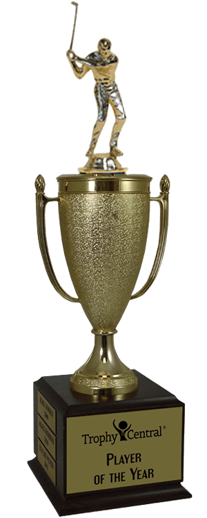 This popular golf champion's cup trophy features a Cherry finish wood base (5 1/2" x 4") and an 8 3/4" gold-tone plastic cup. It also includes up to 4 lines of personalized engraving for free, including name personalization! 1" x 3" Side Plates can be added for an additional price if used as a perpetual trophy. Measures about 13" tall! Great for golf season events and tournament recognition. Ships from: Marquette, Michigan. SKU: champ-cup-golf-tc.