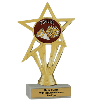 Our economy insert trophy features a real white marble base with a gold insert holder and 2" Cheerleading insert. Measures approximately 6 7/8" - 7 1/8" tall. Add up to three lines of text personalized engraving for free, including individual names! Ships from: Marquette, Michigan. SKU: cheerleading-e-part-i-tc.