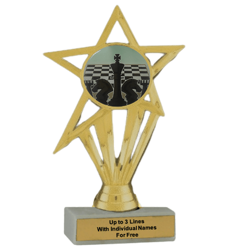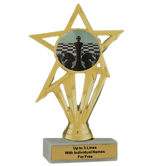 Our economy insert trophy features a real white marble base with a gold insert holder and 2" Chess insert. Measures approximately 6 7/8" - 7 1/8" tall. Add up to three lines of text personalized engraving for free, including individual names! Outstanding for recognizing chess excellence and achievement. Ships from: Marquette, Michigan. SKU: chess-e-part-i-tc.