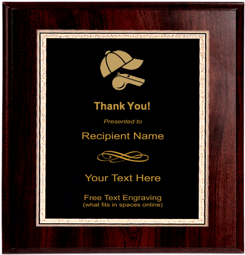 This coach award plaque features a stock coach logo, your text personalized engraving and a beautiful Cherry wood finish. Use our personalization wizard and select 'Use popular template' or create your own unique design! Coach plaques are available in three popular sizes, 9"x7", 10"x8" and 12"x9". Please select below. Stock artwork and text personalized engraving is free! Shown with a black personalized engraving plate with gilded edge. Ships from: Marquette, Michigan. SKU: coach-plaque-tc.
