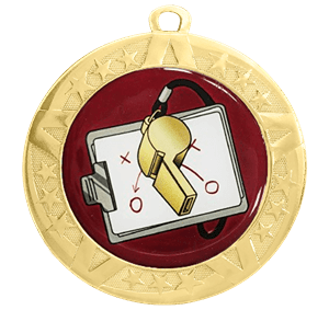 These coach insert medals feature a 2 3/4 inch gold frame with a colorful 2 inch Epoxy dome subject sticker. Each medal also includes a red, white and blue neck ribbon. Optional personalization on back. Wonderful for acknowledging accomplishments and milestones. Ships from: Marquette, Michigan. SKU: coach-jigf-tc.