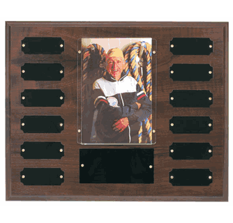 This employee of the month plaque measures 10 1/2" x 13" and features a stunning Cherry finish with 12 nameplates. It also holds a 4 x 6 photo (slides in) so you can recognize a special employee or staff member. The main plate below the photo is 2" X 4 1/4" laserable brass and each perpetual plate is 1" X 2 1/2". The price includes free text personalized engraving on the main plate and one name plate as well. Excellent for employee of the month programs and workplace recognition. Ships from: Marquette, Michigan. SKU: 466-36-tc.