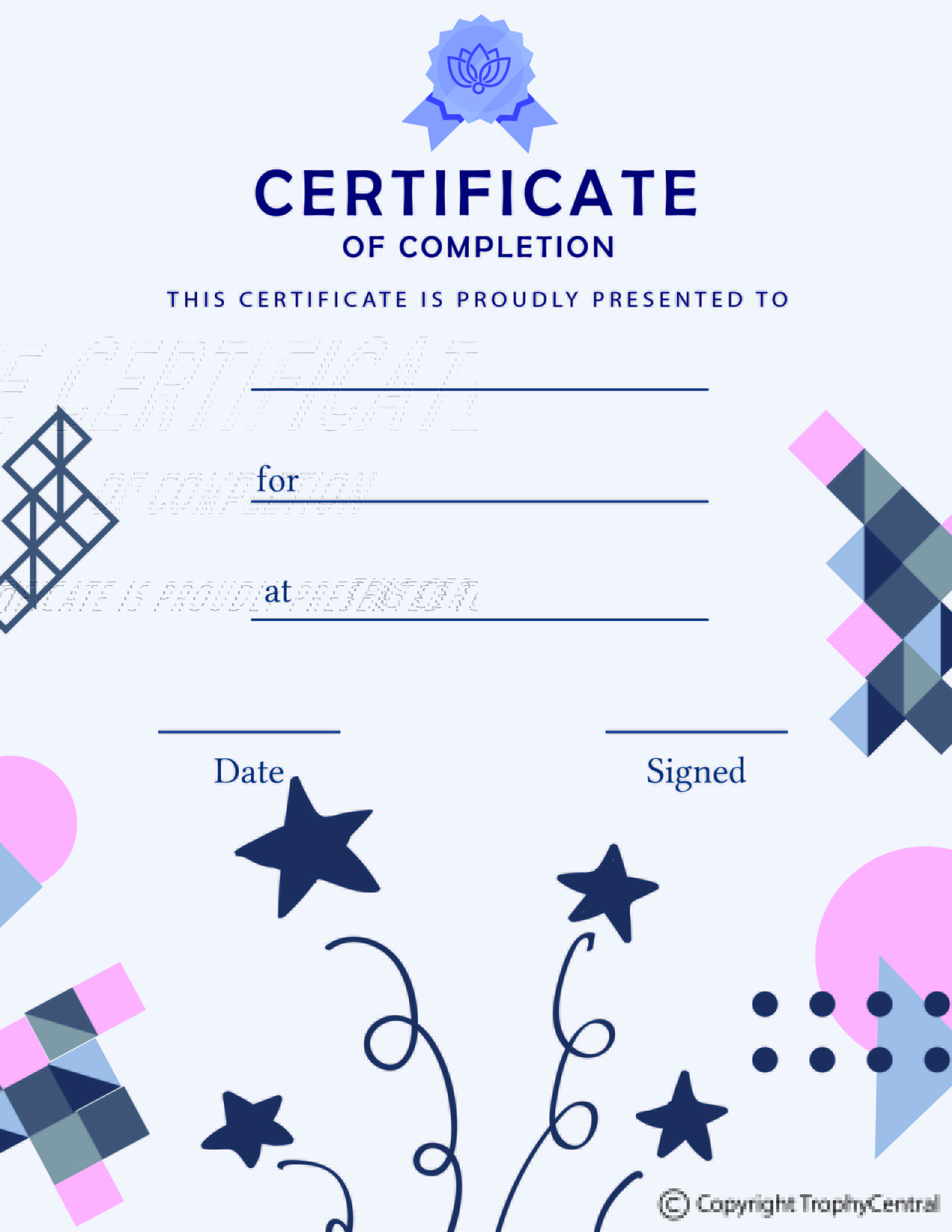 This is a free Certificate of Completion Award template! Our free award certificates were designed to be printable and use less ink to save you money. Simply press the View Now Button and then right click on the image and select Save File to download it. Award certificates measure 8 1/2" x 11". Outstanding for recognizing achievement and success. SKU: academic-free-tc.