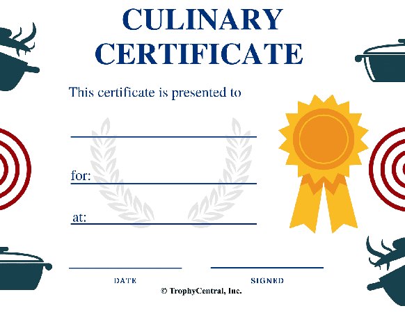 Our Culinary Award template is a perfect for recognizing any chef's cooking skills! Our free certificates were designed to be printable and use less ink to save you money. Simply press the View Now Button and then right click on the image and select Save File to download it. Award certificates measure 8 1/2" x 11". SKU: culinary-award-free-tc.