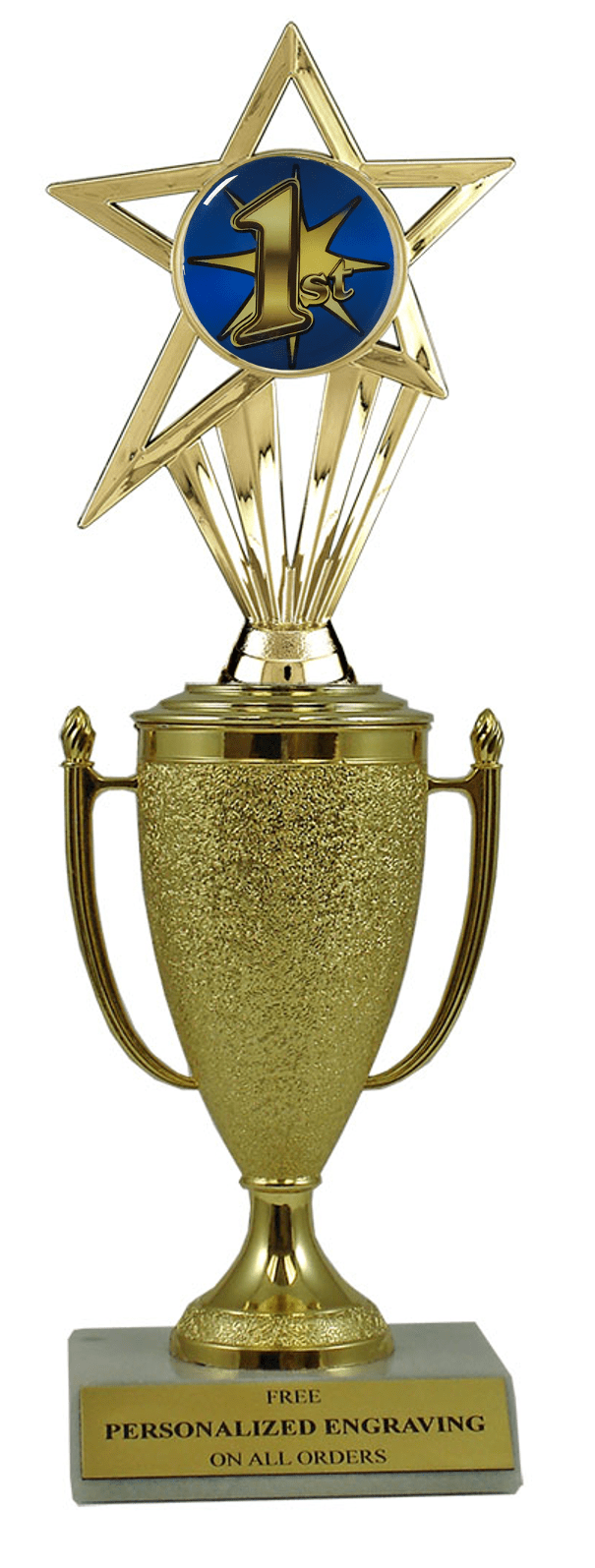 Recognize a special achievement with our fabulous cup & insert trophy. Features a gold cup and 1st place insert with a high-quality slant-front marble base. Includes up to 3 lines of black text personalized engraving on a gold flexi-plate. Quantity discounts available. Use our Personalization Wizard to easily enter your personalized engraving. A great choice for acknowledging excellence and victory. Ships from: Marquette, Michigan. SKU: cup-1st-in-tc.