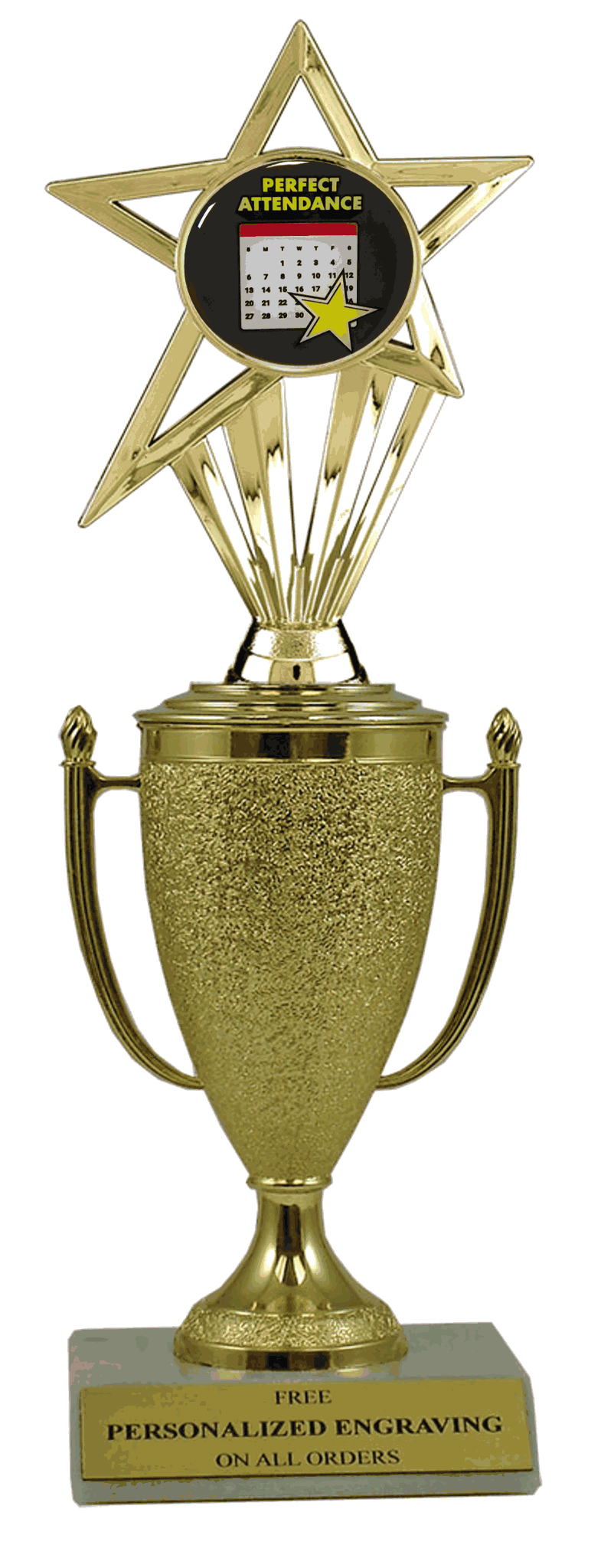 Recognize a special achievement with our fabulous cup & insert trophy. Features a gold cup and perfect attendance insert with a high-quality slant-front marble base. Includes up to 3 lines of black text personalized engraving on a gold flexi-plate. Quantity discounts available. Use our Personalization Wizard to easily enter your personalized engraving. Use to create awards recognizing perfect attendance and reliability. Ships from: Marquette, Michigan. SKU: cup-attendance-in-tc.