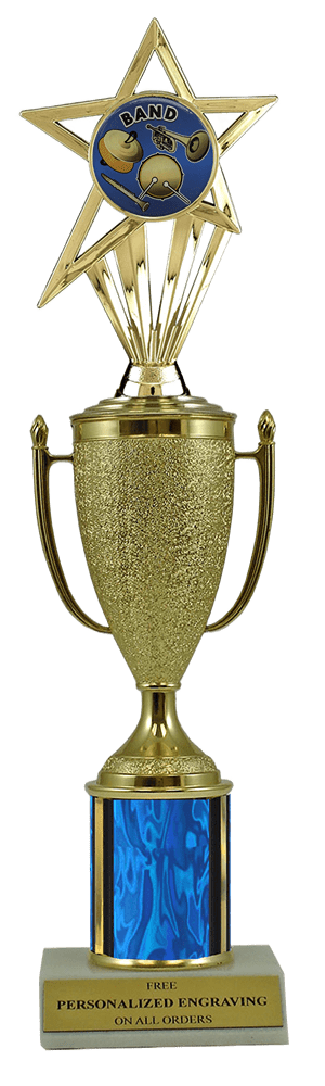 This unique award features a real marble slant-front base, choice of column color and a gold cup with a fabulous band insert. It also includes up to 3 lines of personalized engraving for free. This trophy is a great choice when you want to recognize a special band achievement but don't want to spend a fortune. Select size and color below. Magnificent for recognizing excellence and victory. Ships from: Marquette, Michigan. SKU: cup-band-scb-i-mqt.