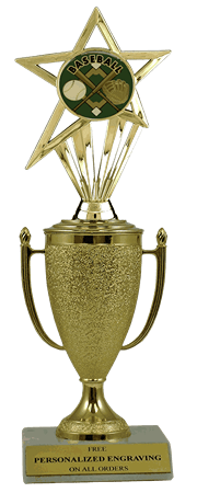 Recognize a special achievement with our classic cup trophy. Features a gold cup and baseball figure with a high-quality slant-front marble base. Includes up to 3 lines of black text personalized engraving on a gold flexi-plate. Quantity discounts available. Use our Personalization Wizard to easily enter your personalized engraving. Looking for something different? See all of our baseball awards. Perfect for baseball season tournaments and championship games. Ships from: Marquette, Michigan. SKU: cup-baseb-p-tc.