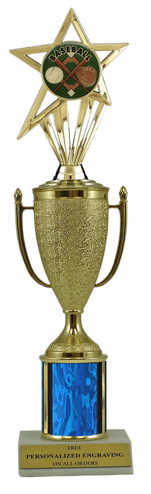This unique award features a real marble slant-front base, choice of column color and a gold cup with a fabulous baseball insert. It also includes up to 3 lines of personalized engraving for free. This trophy is a great choice when you want to recognize a special baseball achievement but don't want to spend a fortune. Select size and color below. Perfect for baseball season tournaments and championship games. Ships from: Marquette, Michigan. SKU: cup-baseball-scb-i-mqt.