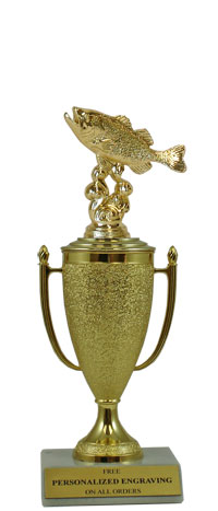 Recognize a special achievement with our classic cup trophy. Features a gold cup and bass figure with a high-quality slant-front marble base. Includes up to 3 lines of black text personalized engraving on a gold flexi-plate. Quantity discounts available. Use our Personalization Wizard to easily enter your personalized engraving. Magnificent for recognizing excellence and victory. Ships from: Marquette, Michigan. SKU: cup-bass-p-qtt.