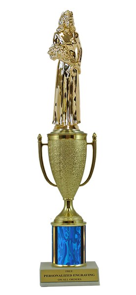 This unique design combines a gold cup with a beauty queen figure. Award features a real marble slant-front base and choice of column color. It also includes up to 3 lines of personalized engraving for free. This trophy is a great choice when you want to recognize a special achievement but don't want to spend a fortune. Select size and color below. Magnificent for honoring excellence and victory. Ships from: Marquette, Michigan. SKU: cup-beaut-scb-tc.