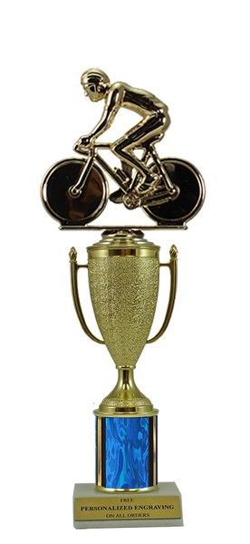 This unique design combines a gold cup with a bicycle figure. Award features a real marble slant-front base and choice of column color. It also includes up to 3 lines of personalized engraving for free. This trophy is a great choice when you want to recognize a special achievement but don't want to spend a fortune. Select size and color below. Magnificent for recognizing excellence and victory. Ships from: Marquette, Michigan. SKU: cup-bike-scb-tc.