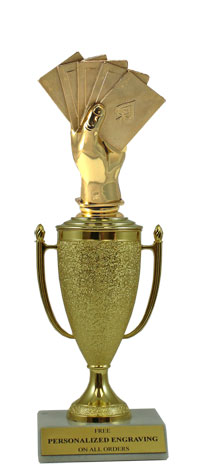 Recognize a special achievement with our classic cup trophy. Features a gold cup and cards figure with a high-quality slant-front marble base. Includes up to 3 lines of black text personalized engraving on a gold flexi-plate. Quantity discounts available. Use our Personalization Wizard to easily enter your personalized engraving. A wonderful choice for rewarding excellence and victory. Ships from: Marquette, Michigan. SKU: cup-cards-p-tc.