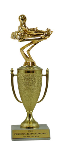 Recognize a special achievement with our classic cup trophy. Features a gold cup and go kart figure with a high-quality slant-front marble base. Includes up to 3 lines of black text personalized engraving on a gold flexi-plate. Quantity discounts available. Use our Personalization Wizard to easily enter your personalized engraving. Measures approximately 10" tall. Ships from: Marquette, Michigan. SKU: cup-cart-p-tc.