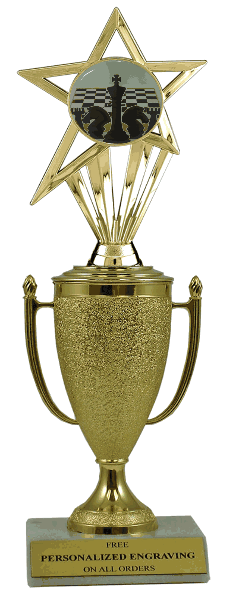 Recognize a special achievement with our fabulous cup & insert trophy. Features a gold cup and chess insert with a high-quality slant-front marble base. Includes up to 3 lines of black text personalized engraving on a gold flexi-plate. Quantity discounts available. Use our Personalization Wizard to easily enter your personalized engraving. Outstanding for acknowledging chess excellence and achievement. Ships from: Marquette, Michigan. SKU: cup-chess-in-tc.