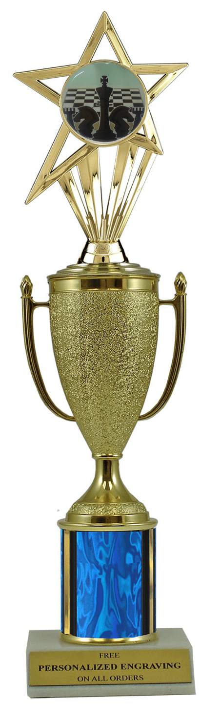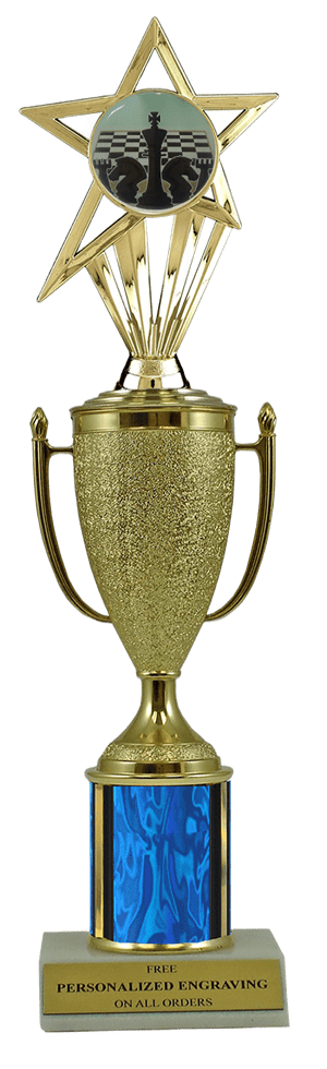 This unique award features a real marble slant-front base, choice of column color and a gold cup with a fabulous chess insert. It also includes up to 3 lines of personalized engraving for free. This trophy is a great choice when you want to recognize a special chess achievement but don't want to spend a fortune. Select size and color below. Outstanding for acknowledging chess excellence and achievement. Ships from: Marquette, Michigan. SKU: cup-chess-scb-i-mqt.