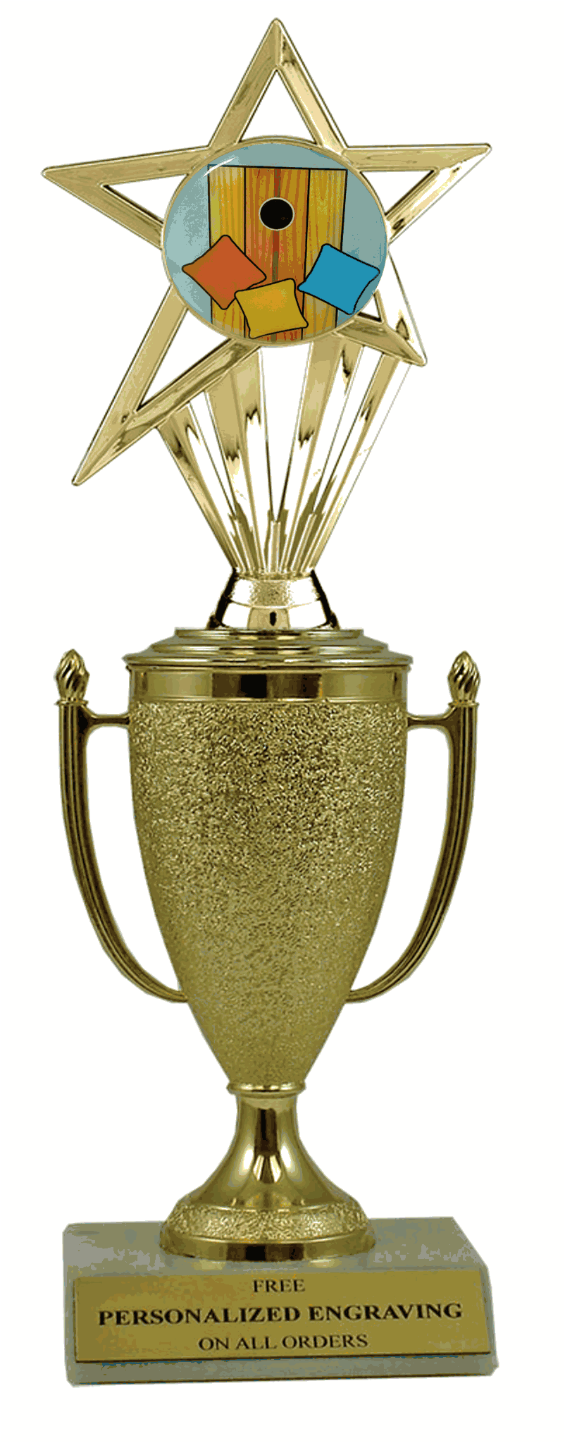 Recognize a special achievement with our fabulous cup & insert trophy. Features a gold cup and cornhole insert with a high-quality slant-front marble base. Includes up to 3 lines of black text personalized engraving on a gold flexi-plate. Quantity discounts available. Use our Personalization Wizard to easily enter your personalized engraving. Magnificent for honoring excellence and victory. Ships from: Marquette, Michigan. SKU: cup-cornhole-in-tc.