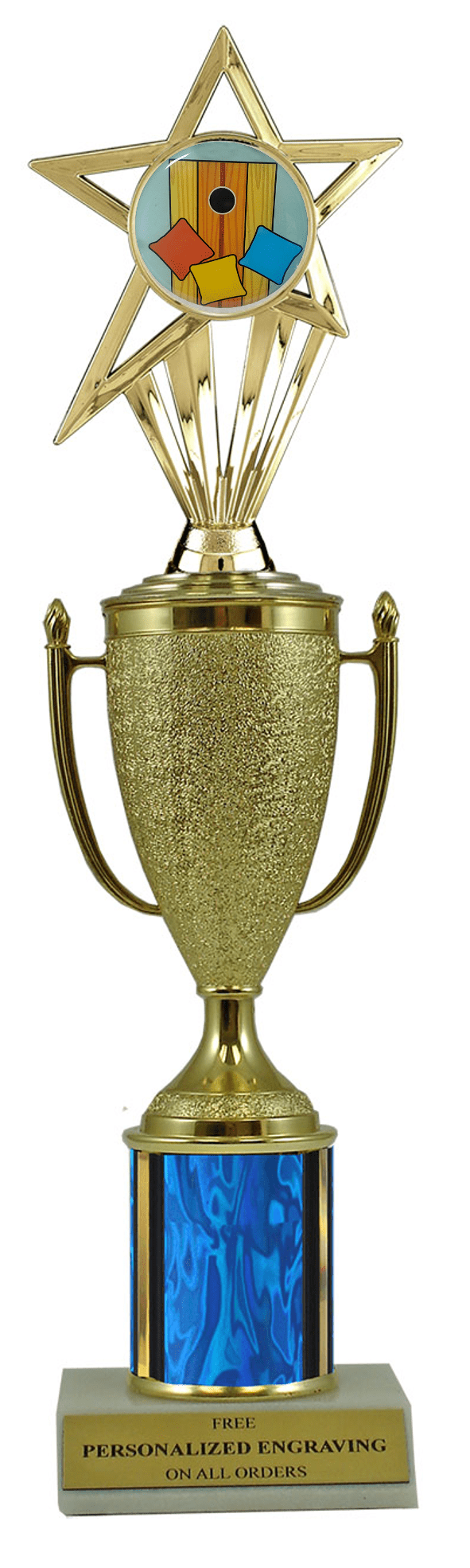 This unique award features a real marble slant-front base, choice of column color and a gold cup with a fabulous cornhole insert. It also includes up to 3 lines of personalized engraving for free. This trophy is a great choice when you want to recognize a special cornhole achievement but don't want to spend a fortune. Select size and color below. A wonderful choice for rewarding excellence and victory. Ships from: Marquette, Michigan. SKU: cup-cornhole-scb-i-mqt.