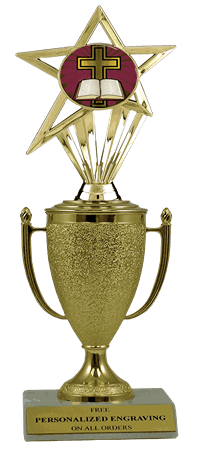 Recognize a special achievement with our fabulous cup & insert trophy. Features a gold cup and cross insert with a high-quality slant-front marble base. Includes up to 3 lines of black text personalized engraving on a gold flexi-plate. Quantity discounts available. Use our Personalization Wizard to easily enter your personalized engraving. Magnificent for recognizing excellence and victory. Ships from: Marquette, Michigan. SKU: cup-cross-in-tc.