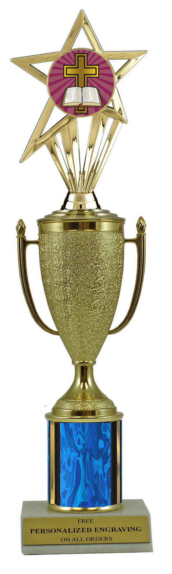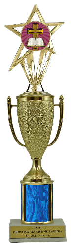 This unique award features a real marble slant-front base, choice of column color and a gold cup with a fabulous cross insert. It also includes up to 3 lines of personalized engraving for free. This trophy is a great choice when you want to recognize a special cross achievement but don't want to spend a fortune. Select size and color below. Magnificent for recognizing excellence and victory. Ships from: Marquette, Michigan. SKU: cup-cross-scb-i-mqt.