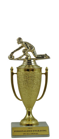 Recognize a special achievement with our classic cup trophy. Features a gold cup and curling figure with a high-quality slant-front marble base. Includes up to 3 lines of black text personalized engraving on a gold flexi-plate. Quantity discounts available. Use our Personalization Wizard to easily enter your personalized engraving. A great choice for acknowledging excellence and victory. Ships from: Marquette, Michigan. SKU: cup-curl-p-tc.