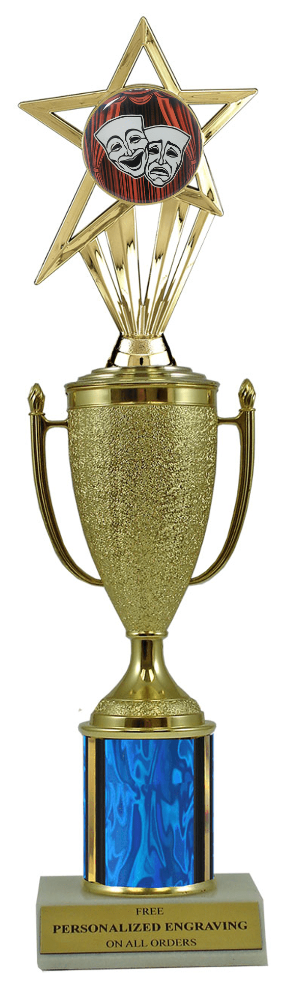 This unique award features a real marble slant-front base, choice of column color and a gold cup with a fabulous drama insert. It also includes up to 3 lines of personalized engraving for free. This trophy is a great choice when you want to recognize a special drama achievement but don't want to spend a fortune. Select size and color below. Magnificent for celebrating excellence and victory. Ships from: Marquette, Michigan. SKU: cup-drama-scb-i-mqt.