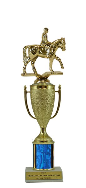 This unique design combines a gold cup with a equestrian figure. Award features a real marble slant-front base and choice of column color. It also includes up to 3 lines of personalized engraving for free. This trophy is a great choice when you want to recognize a special achievement but don't want to spend a fortune. Select size and color below. Magnificent for recognizing excellence and victory. Ships from: Marquette, Michigan. SKU: cup-equest-scb-qtt.