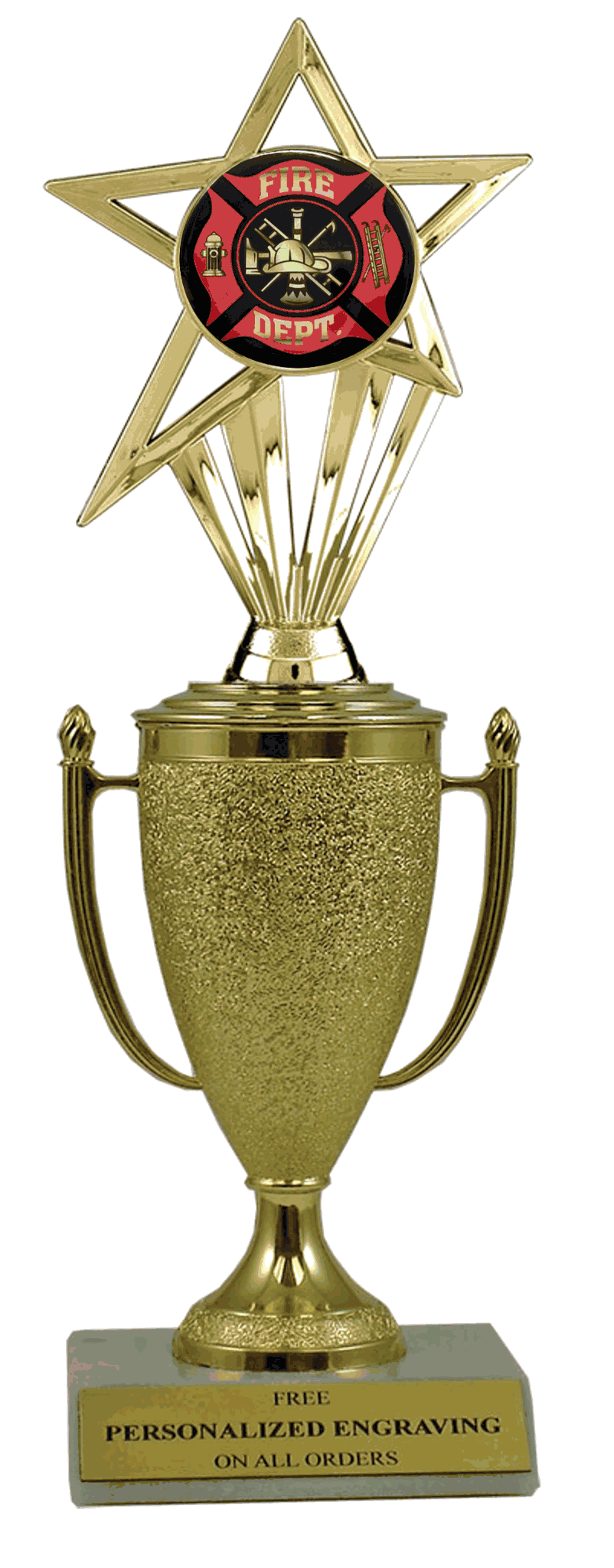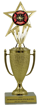Recognize a special achievement with our fabulous cup & insert trophy. Features a gold cup and fire department insert with a high-quality slant-front marble base. Includes up to 3 lines of black text personalized engraving on a gold flexi-plate. Quantity discounts available. Use our Personalization Wizard to easily enter your personalized engraving. Ships from: Marquette, Michigan. SKU: cup-fire-department-in-tc.