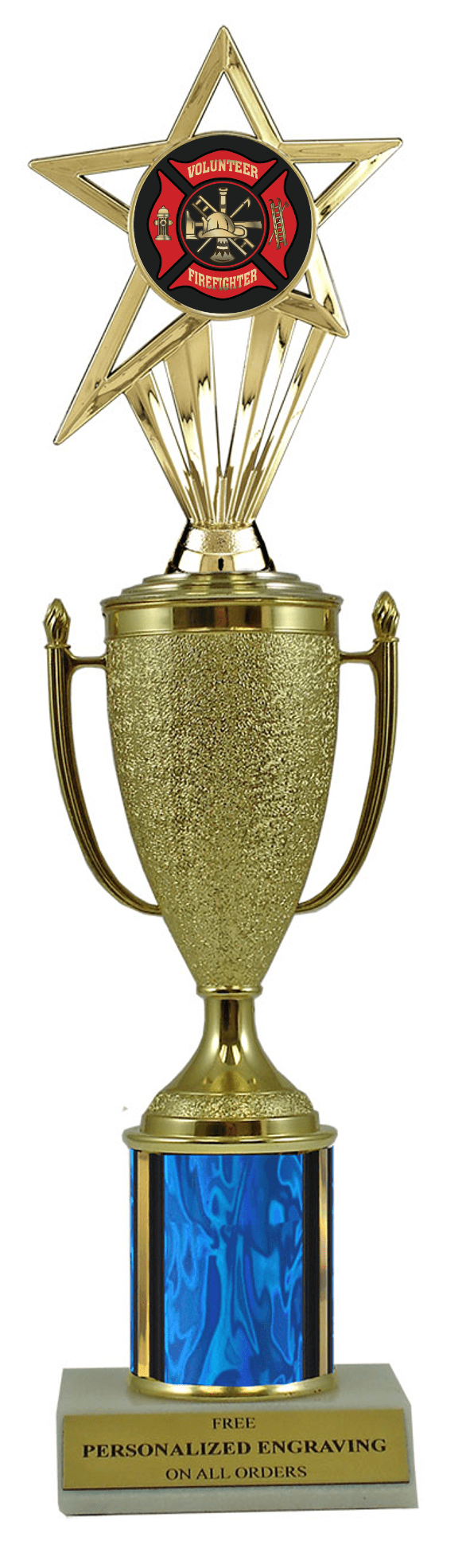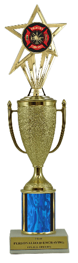 This unique award features a real marble slant-front base, choice of column color and a gold cup with a fabulous firefighter insert. It also includes up to 3 lines of personalized engraving for free. This trophy is a great choice when you want to recognize a special firefighter achievement but don't want to spend a fortune. Select size and color below. A great choice for acknowledging excellence and victory. Ships from: Marquette, Michigan. SKU: cup-firefighter-scb-i-mqt.