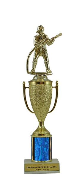 This unique design combines a gold cup with a fireman figure. Award features a real marble slant-front base and choice of column color. It also includes up to 3 lines of personalized engraving for free. This trophy is a great choice when you want to recognize a special achievement but don't want to spend a fortune. Select size and color below. Magnificent for honoring excellence and victory. Ships from: Marquette, Michigan. SKU: cup-fireman-scb-qtt.