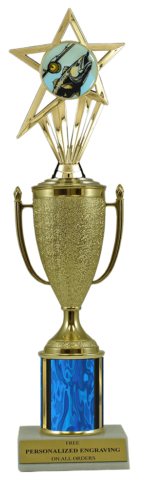 This unique award features a real marble slant-front base, choice of column color and a gold cup with a fabulous fishing insert. It also includes up to 3 lines of personalized engraving for free. This trophy is a great choice when you want to recognize a special fishing achievement but don't want to spend a fortune. Select size and color below. Outstanding for rewarding fishing skills and dedication. Ships from: Marquette, Michigan. SKU: cup-fishing-scb-i-mqt.