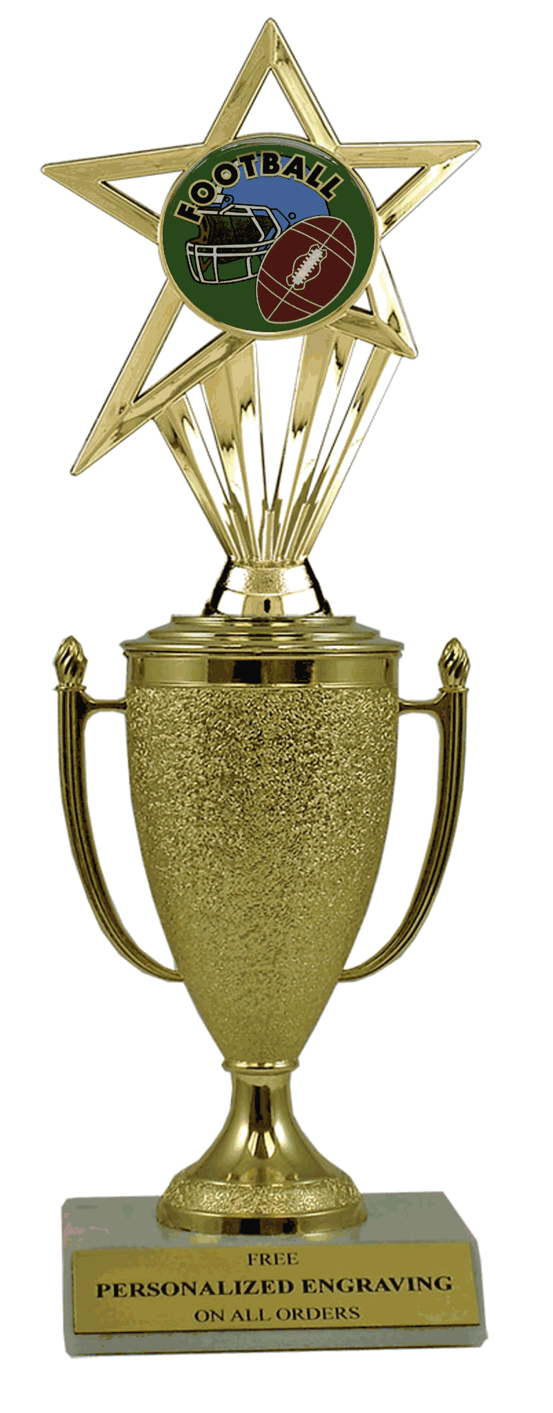 Recognize a special achievement with our fabulous cup & insert trophy. Features a gold cup and football insert with a high-quality slant-front marble base. Includes up to 3 lines of black text personalized engraving on a gold flexi-plate. Quantity discounts available. Use our Personalization Wizard to easily enter your personalized engraving. Perfect for football season recognition and championship honors. Ships from: Marquette, Michigan. SKU: cup-football-in-tc.