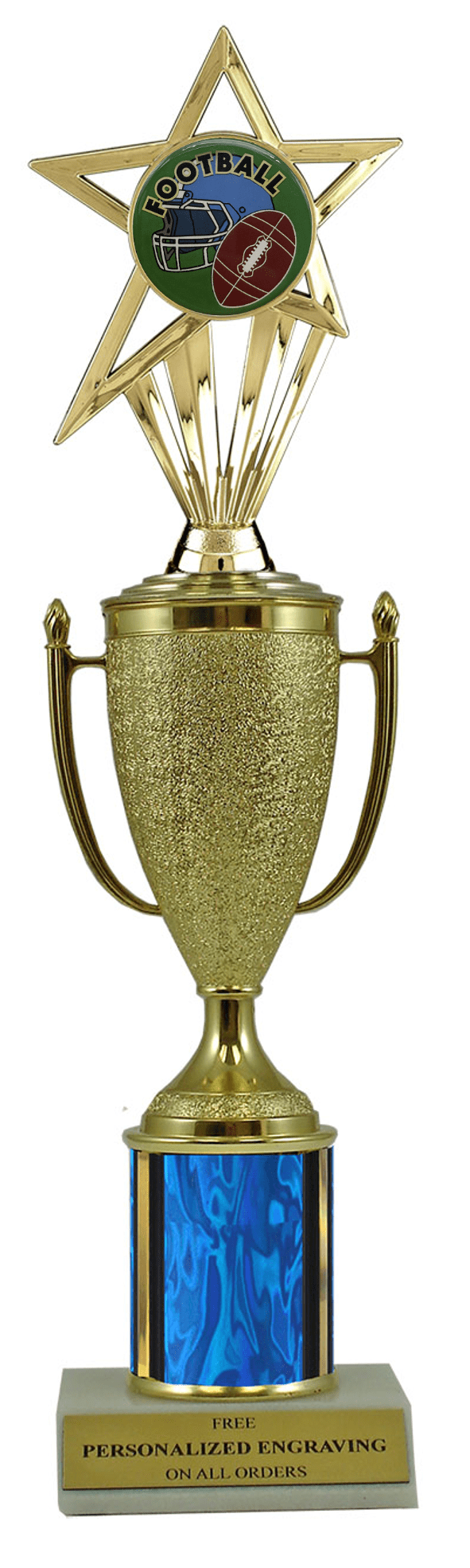 This unique award features a real marble slant-front base, choice of column color and a gold cup with a fabulous football insert. It also includes up to 3 lines of personalized engraving for free. This trophy is a great choice when you want to recognize a special football achievement but don't want to spend a fortune. Select size and color below. Perfect for football season recognition and championship honors. Ships from: Marquette, Michigan. SKU: cup-football-scb-i-mqt.